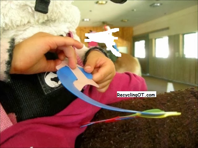 The last video demonstrates how to cut a long, very long-strip of plastic to weave shapes onto. This is great for children or adults with developmental disabilities who enjoy repetitive fine-motor tasks. Color or shape sequencing is optional.